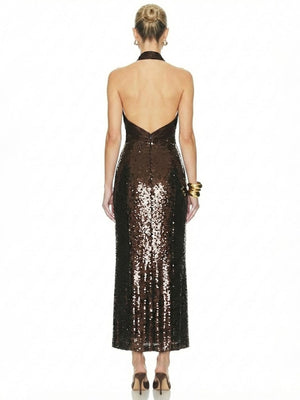 Criss-Cross Halter Sequin Shimmering Backless Evening Maxi Dress