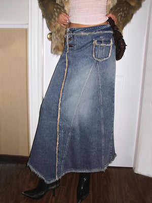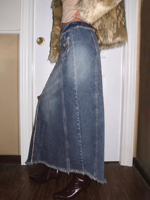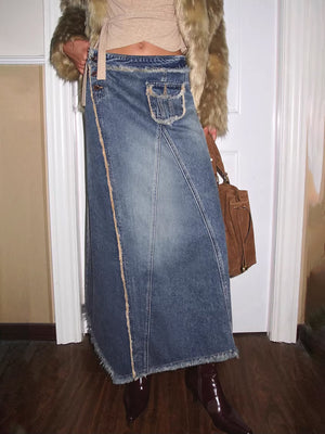 Deconstructed Patchwork Raw-Hem Denim Maxi Skirt