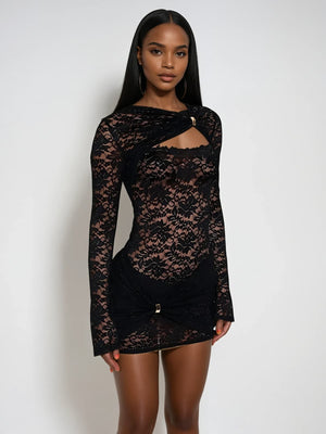 Elevate your style with the Eustace Long Sleeve Lace Bodysuit Set In Black. This elegant piece features delicate lace detailing paired with stylish cutouts that accentuate your silhouette. The long sleeves offer a sophisticated balance to the playful mini length, perfect for making a confident statement at any event. Designed to blend charm with modern edge, this bodysuit ensures you stand out with effortless grace.