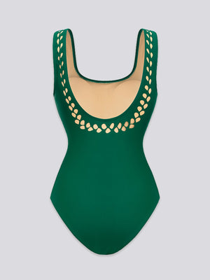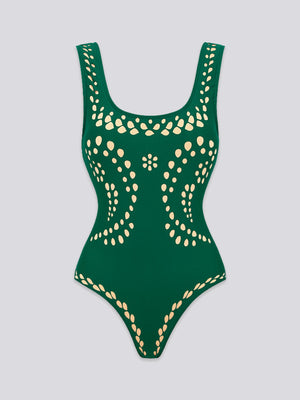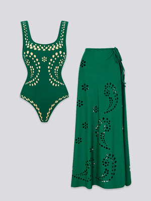This creation defines architectural luxury and high-impact resort drama. Featuring a snatched bodysuit base and a matching eyelet-cutout skirt, it’s the ultimate show-stopper for your next exclusive poolside getaway.