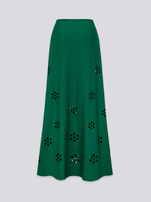 - High-waisted floor-length skirt features a daring side split for fluid and graceful movement.