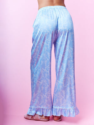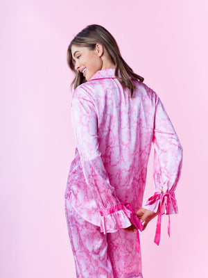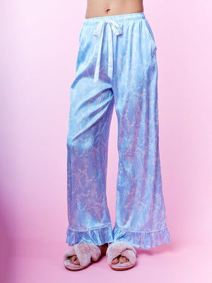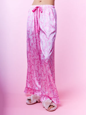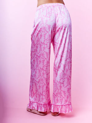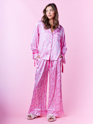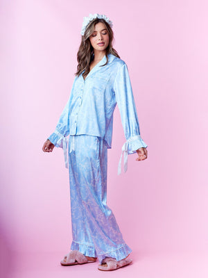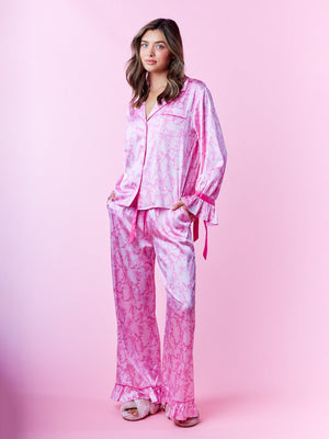 Indulge in nightly luxury with this elegantly coordinated collection. This sophisticated ensemble features a long-sleeve top designed with a classic notched collar and sleek front button closures. The highlight is the charming ruffled cuffs adorned with delicate ribbon ties, adding a romantic touch to the relaxed silhouette. Paired with matching wide-leg trousers that mirror the ruffled hem detail, these pieces are crafted from a smooth, lustrous material for a soft feel against the skin. Perfect for elevated lounging or as a refined addition to your evening routine.