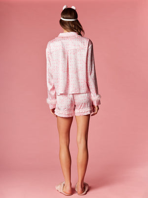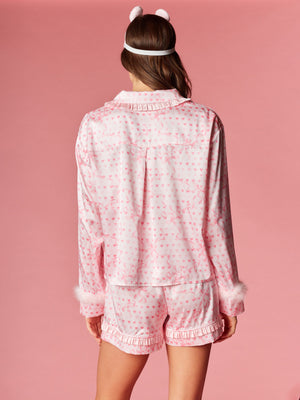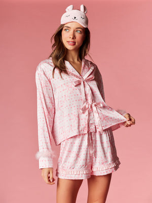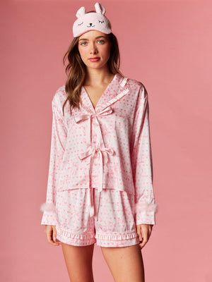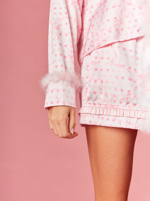 Fall in love with your nighttime routine in this sweet and playful ensemble. This collection features a charming heart and ribbon motif throughout, designed to add a romantic touch to your evening. The top is detailed with a dainty ruffled collar and feminine front ribbon ties, while the sleeves are finished with plush faux-fur cuffs for a hint of luxury. Paired with matching shorts that feature a flirty ruffled hem, these pieces are completed by a coordinated sleep mask for the ultimate dreamy aesthetic.