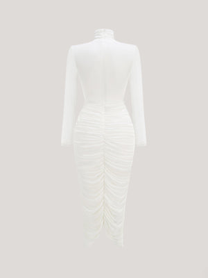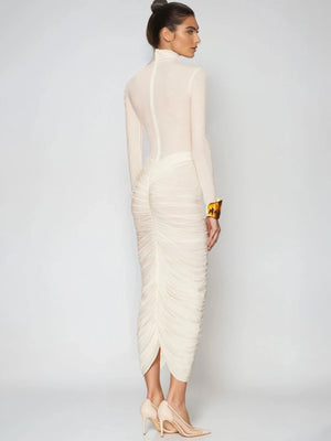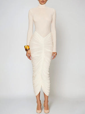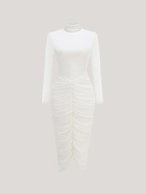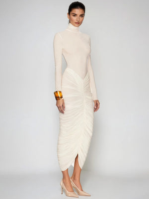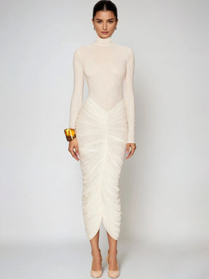 High-Neck Ruched Long-Sleeve Maxi Dress