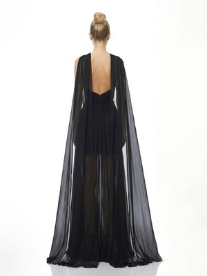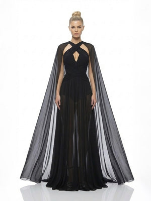 Embrace dark romance in this ethereal and statuesque creation. The halter-style bodice features a daring keyhole cutout and structured criss-cross waist detailing to define the figure. Dramatic, floor-sweeping cape panels flow from the shoulders, adding regal movement to the airy, pleated skirt. This piece is finished with a stunning open-back design, making it a captivating choice for high-end celebrations.