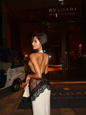This creation is made for the minimalist who wants high-impact glamour without compromising on comfort. Featuring a statuesque halter neckline and dramatic backless silhouette, this piece will lift and shape your frame with architectural lace panelling. Crafted from premium high-stretch fabric for a snatched fit, it's the ultimate show-stopping look that you'll never want to take off.