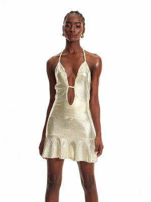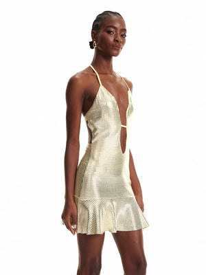 Luminous Halter-Neck Metallic Ruffle Mini Dress