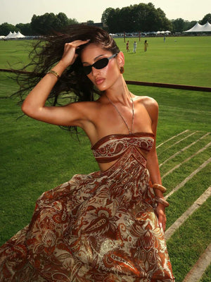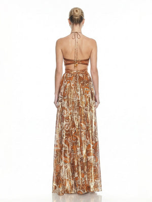 Define elegance in this bohemian-inspired creation featuring a high-shine metallic finish. This piece is adorned with an intricate paisley motif and a sophisticated halter neck that ties at the reverse for an adjustable fit. The midriff is highlighted by daring cutout details and structured bands that create a snatched silhouette, while the pleated skirt flows into a statuesque floor-sweeping hem. Perfect for summer galas or luxury travel, this look radiates effortless glamour.