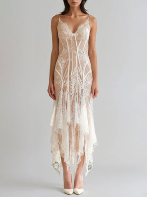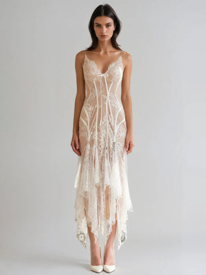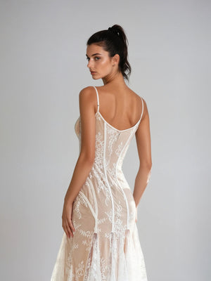 - Sophisticated nude-toned lining provides an alluring "second-skin" illusion while highlighting the ornate white lace overlay.
