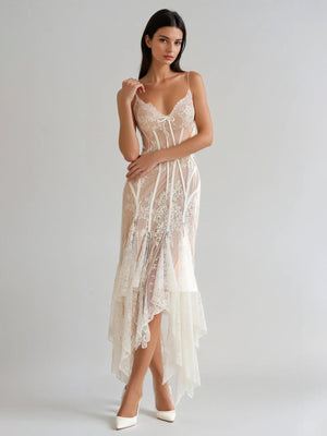 This creation defines ethereal luxury and statuesque romantic grace. Featuring intricate floral filigree lace and cascading asymmetrical ruffles, it’s the ultimate show-stopper for your next exclusive garden party or high-profile coastal event.