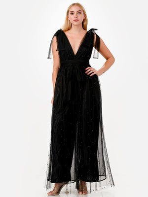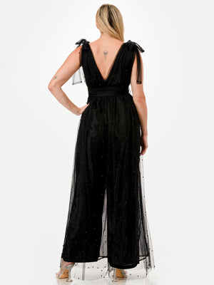 Pearl Studded Tulle Overlay Tie Shoulder Wide Leg Jumpsuit