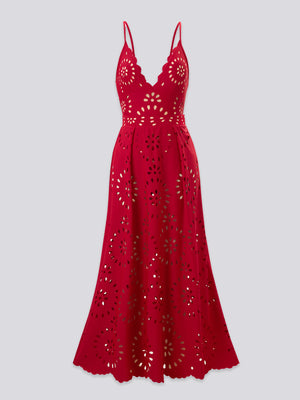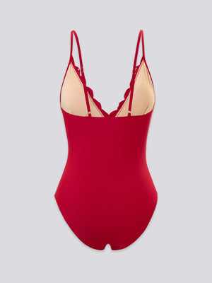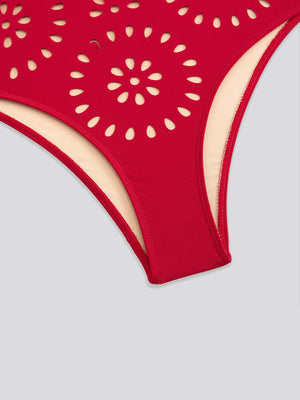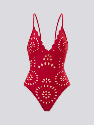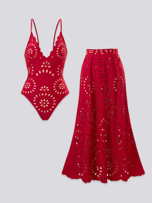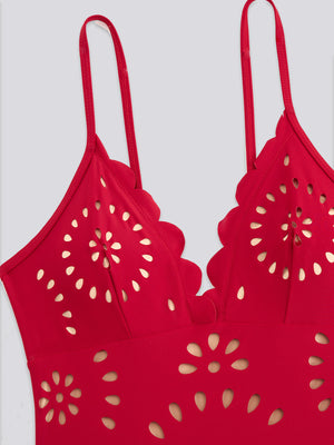Red Scalloped Eyelet Plunging Swimsuit Set