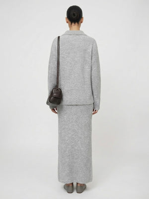 Embrace effortless sophistication in this cozy and versatile two-piece creation. This set features an oversized pullover with a classic polo collar and a deep v-neckline, offering a modern take on timeless knitwear. Paired with a matching straight-leg column skirt, the ensemble creates a streamlined and elongated silhouette. Crafted from a soft, textured ribbed material, this look is designed for comfort without compromising on style.