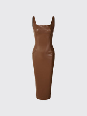 Square Neck Faux Leather Sheath Bodycon Midi Dress