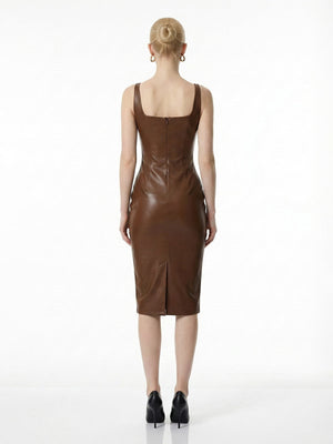 Embrace a bold yet sophisticated look with this sleek synthetic leather piece. It features a sharp square neckline and wide straps that offer a modern, structured silhouette, designed to hug your curves for a snatched, confidence-boosting fit. The supple material provides a high-fashion luster that looks and feels luxurious. At the back, a subtle slit at the hem ensures ease of movement while maintaining a polished aesthetic. Finished with a seamless rear zipper closure, this versatile outfit transitions effortlessly from power meetings to cocktail hour.