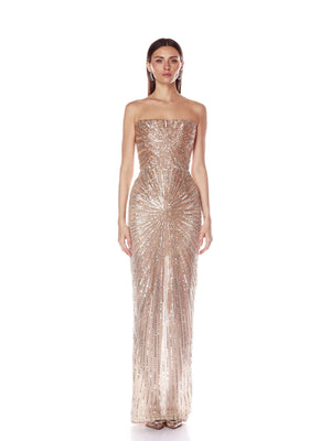 Embody opulence in this light-reflecting masterpiece. This creation is covered in shimmering sequins arranged in a striking sunburst motif to draw the eye inward and flatter the form. The strapless silhouette offers a streamlined column-style fit that elongates the figure for a statuesque look. A full-length rear zipper ensures a seamless and tailored finish, making it a captivating choice for red-carpet events or galas.