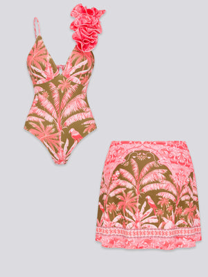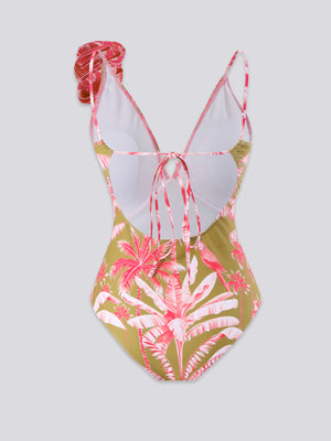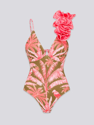This vibrant creation defines tropical luxury and high-impact resort style. Featuring a statuesque one-shoulder silhouette and a dramatic 3D floral accent, it’s the ultimate show-stopper for your next exclusive island getaway.