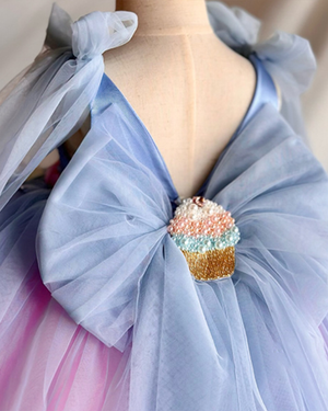 • **Dual-tone ombré skirt** – pink tulle underlayer melts into blue chiffon