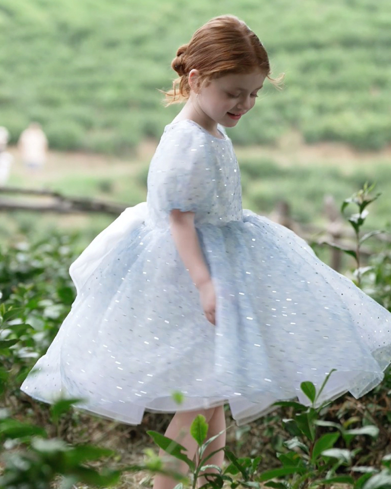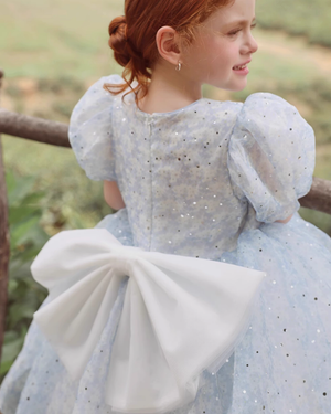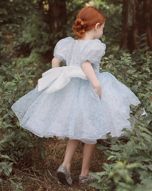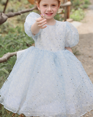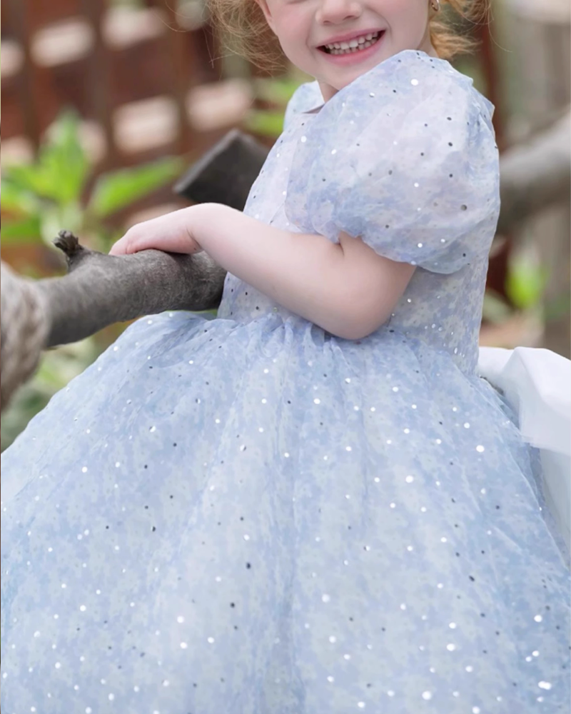 💫 Starlight Puff Sleeve Dress – Sparkle in Ocean Blue & Silver Dust ✨