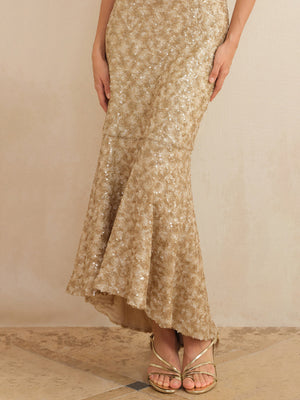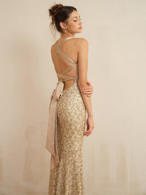 Shimmer from every angle in this light-catching masterpiece. The front features a flattering v-neckline and thin straps that lead to a breathtaking open back. Elegant criss-cross straps and a statement tie-back closure ensure a perfectly snatched fit. Finished with a graceful flared hem, this look creates a stunning trumpet silhouette for your next gala or celebration.