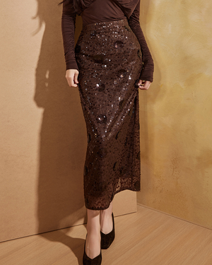 • Design Elements: All-over beaded sequin embroidery, slim pencil silhouette, high-waist long skirt, light-catching shimmer