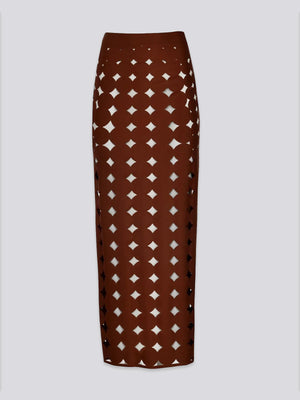 - Dramatic laser-cut maxi skirt adds an architectural and airy layer of movement to your look.