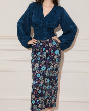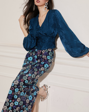 - Design Elements: Capri-blue velvet top, corset-inspired waist, voluminous sleeves, all-over floral sequin pencil skirt