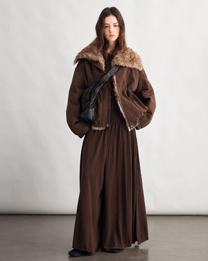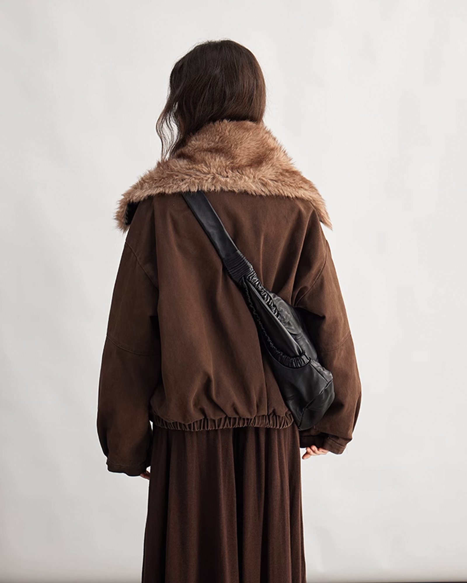 Chestnut Brown Puffer Jacket with Fur Lining - Retro High-Neck Bloom Silhouette