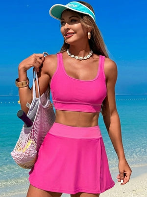 Elevate your active rotation with this performance-driven and feminine creation. This two-piece ensemble features a supportive crop top with a classic scoop neckline and bold contrast piping that defines the figure. On the reverse, the racerback-inspired silhouette ensures maximum range of motion for any high-energy activity. Paired with a coordinating high-waisted skort featuring a wide contrast band, this look provides a snatched fit and a graceful, flared hemline.