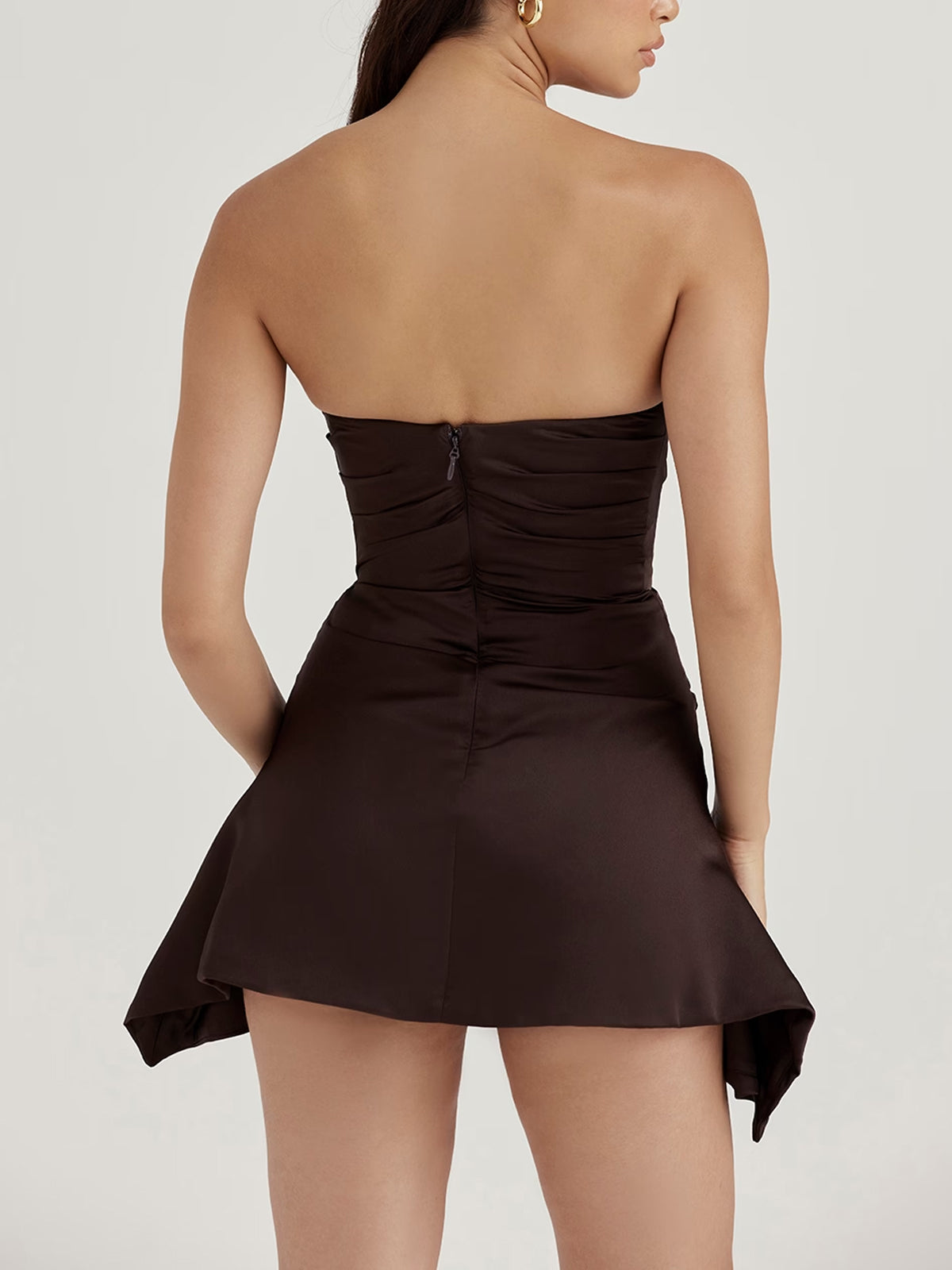 This creation is made for the minimalist who wants high-impact style without compromising on comfort. Featuring a sophisticated strapless neckline and architectural ruching through the bodice, this piece will lift and shape your frame for a truly statuesque look. Crafted from a premium satin-finish fabric, it provides a snatched fit and playful movement with its modern asymmetrical flared hem.