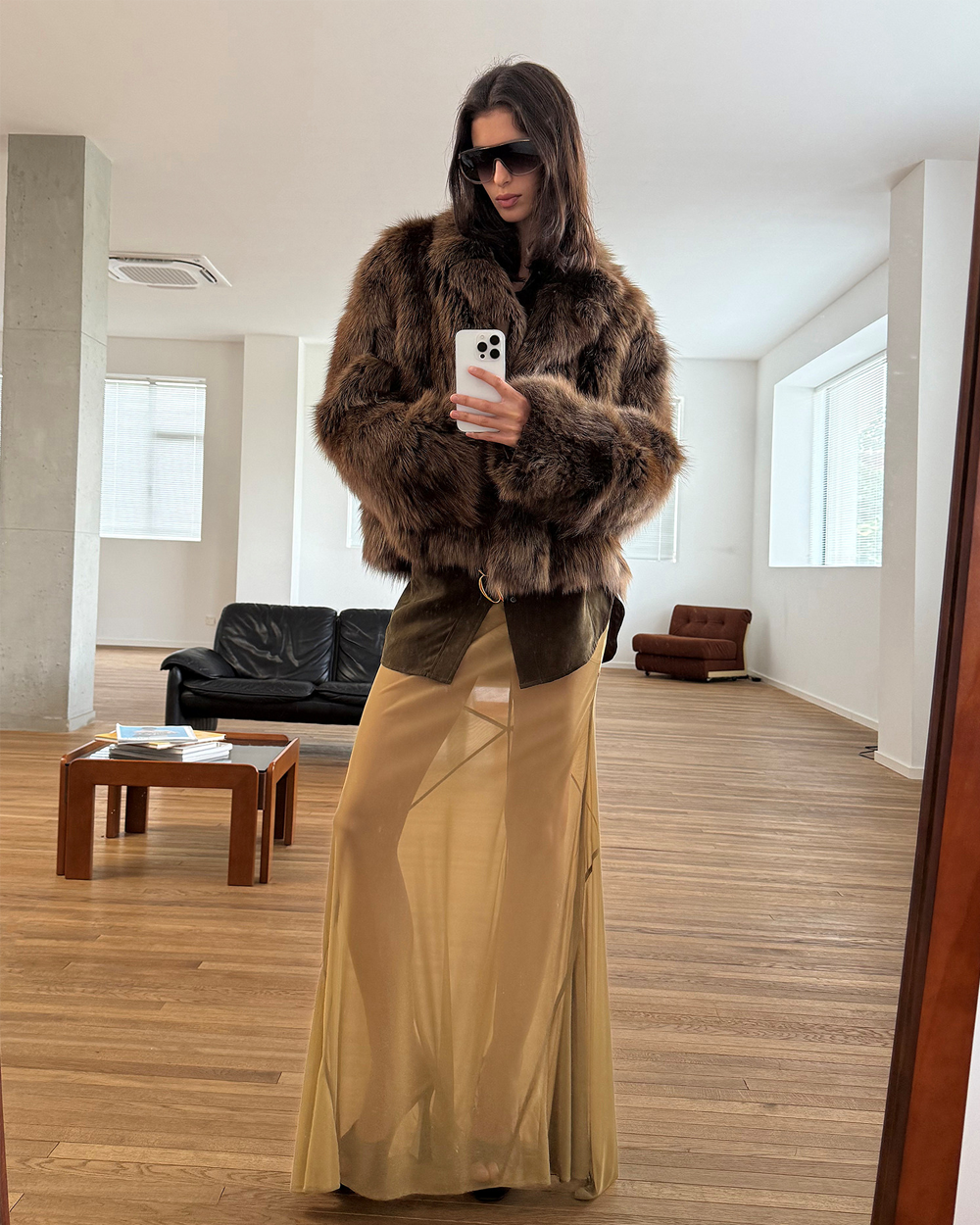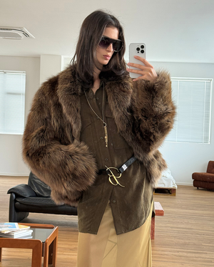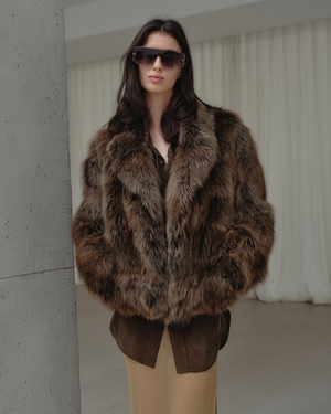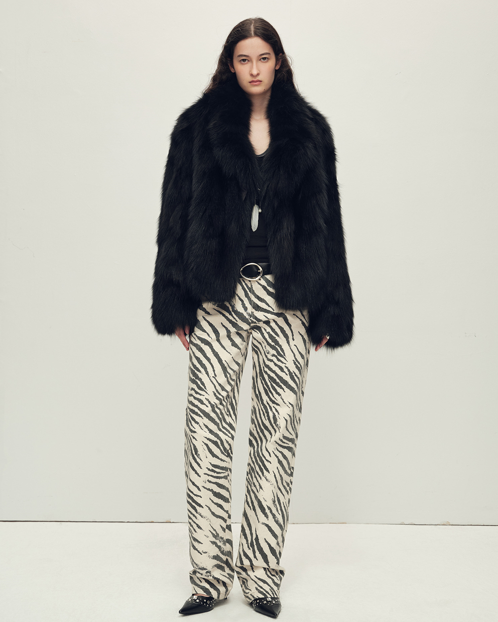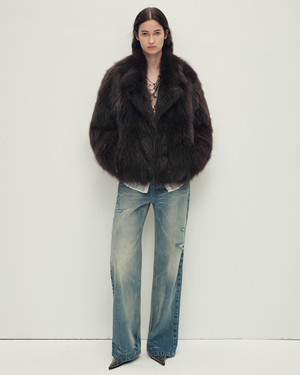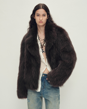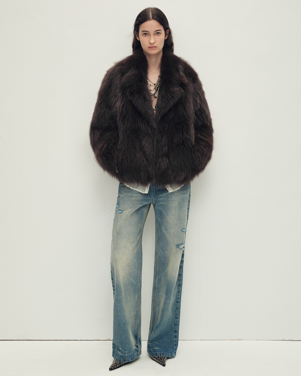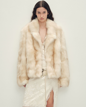 - Design Elements: SagaFurs fox fur with gradient dye effect, sculptural collar, cropped length