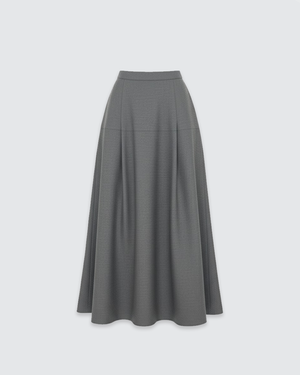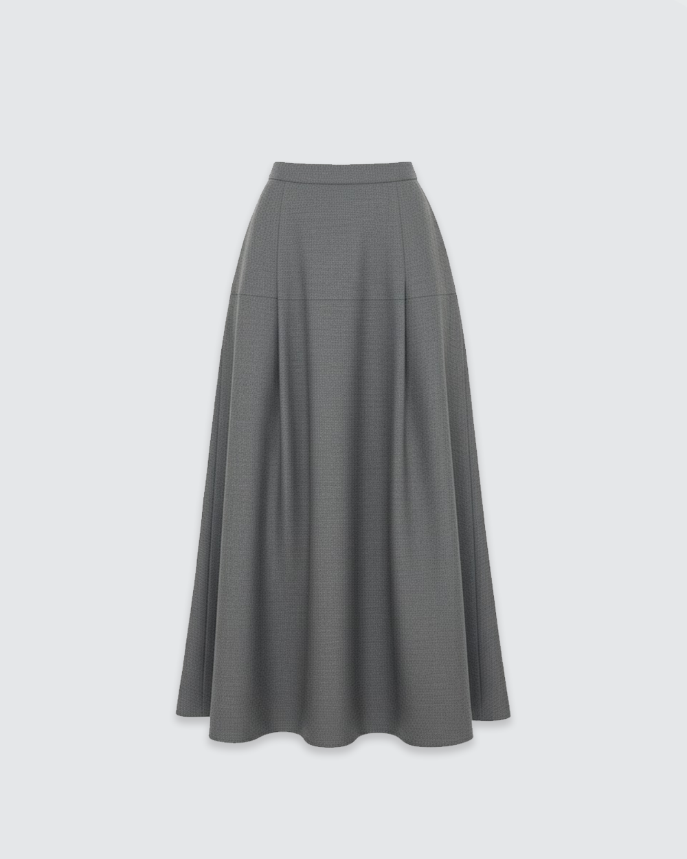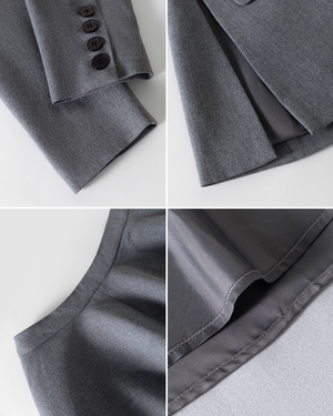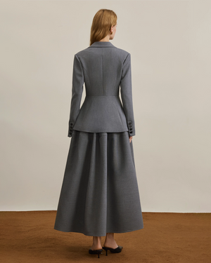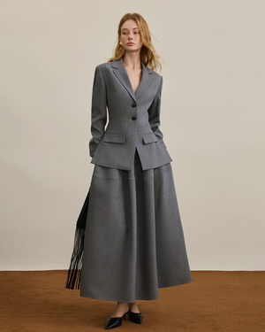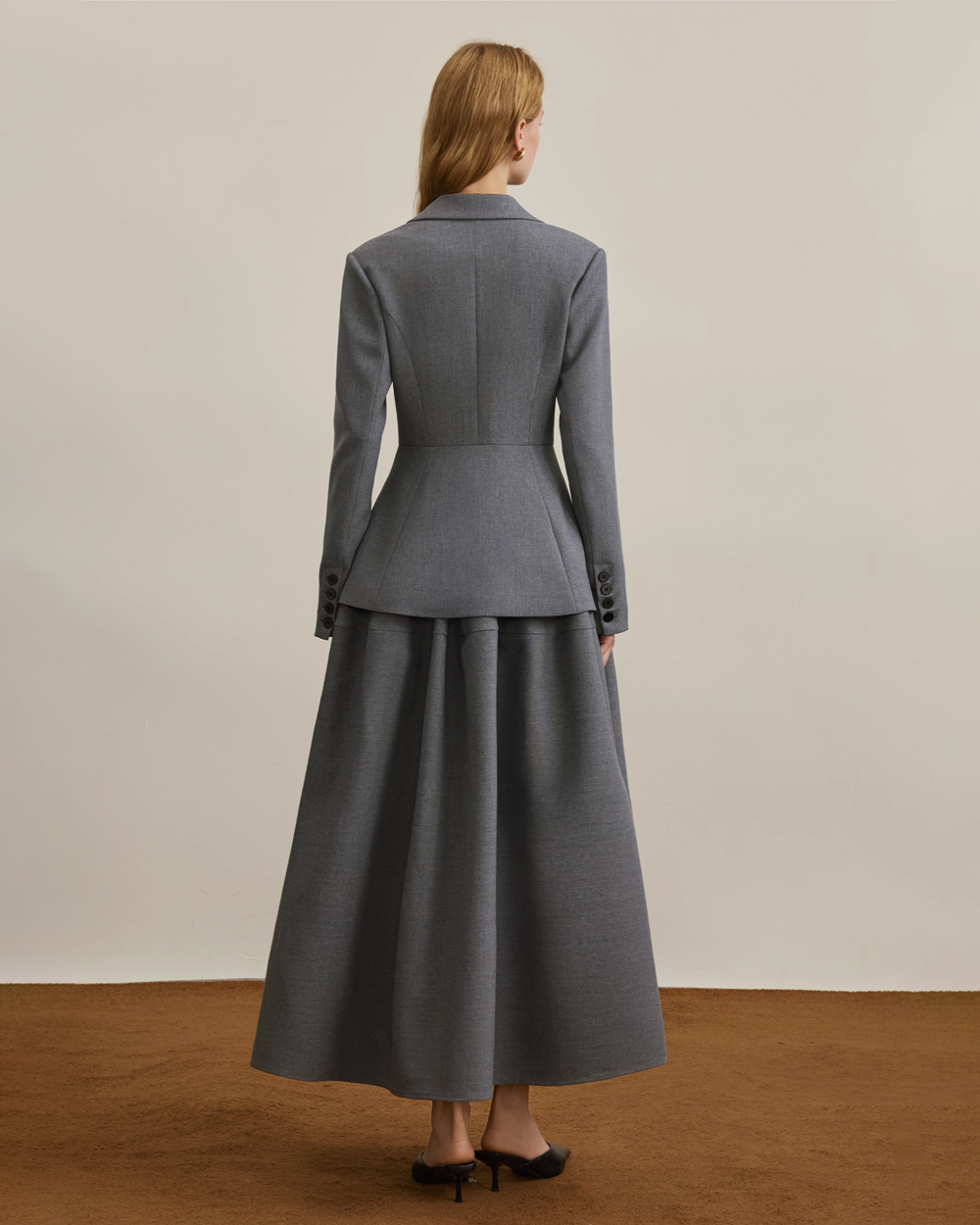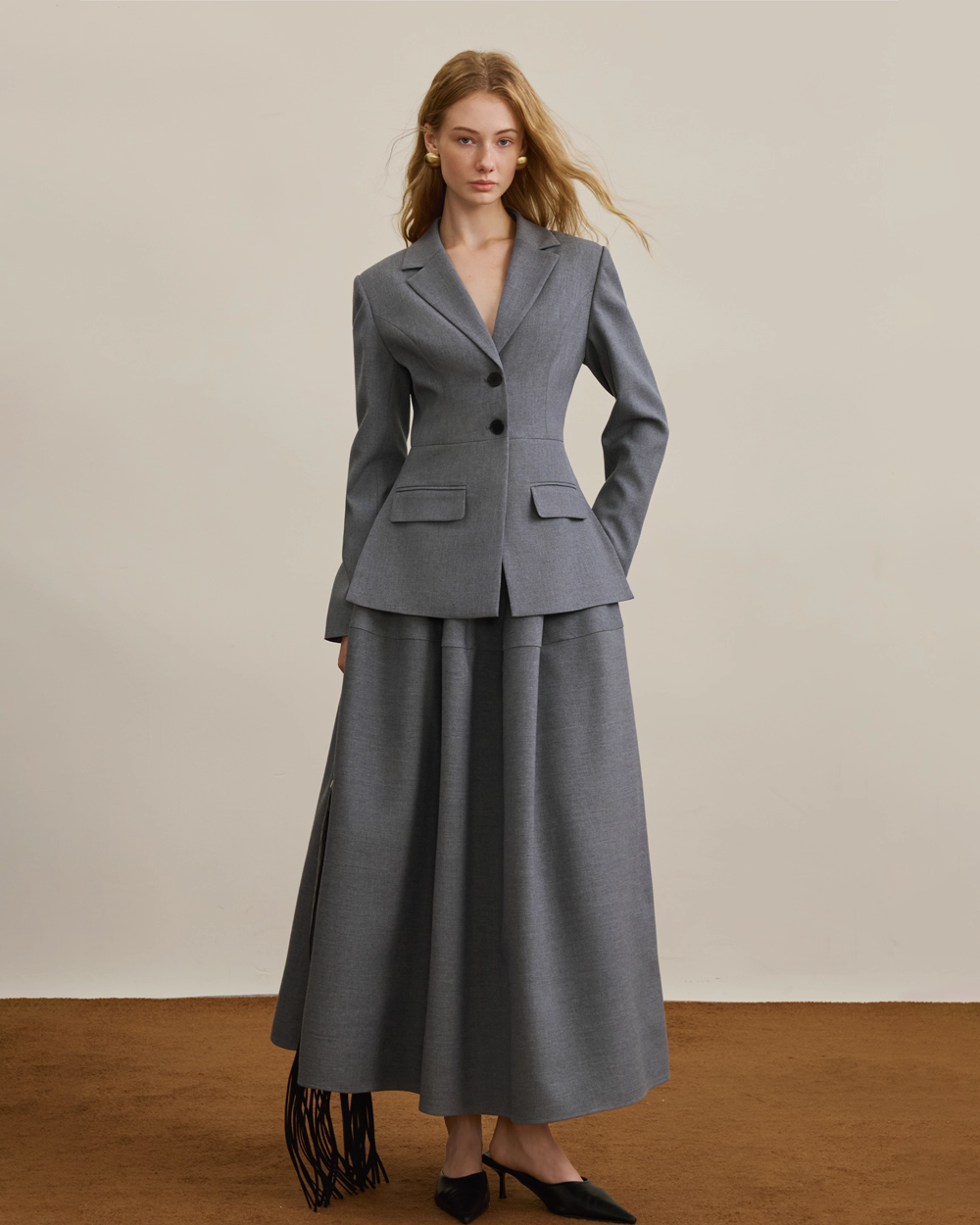 • Design Elements: Structured waist blazer, A-line maxi skirt, tailored silhouette, flap pockets, single-button closure