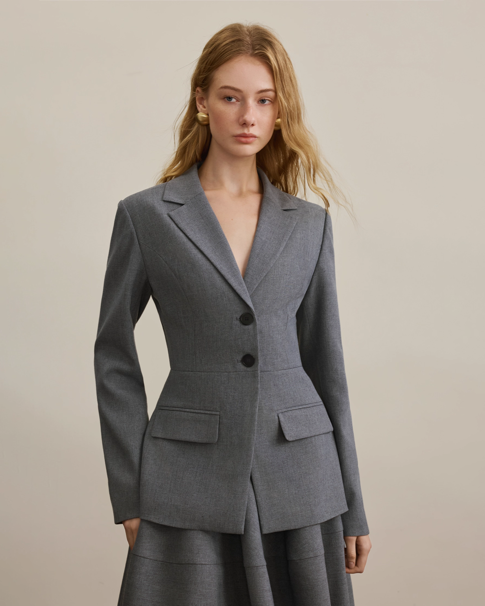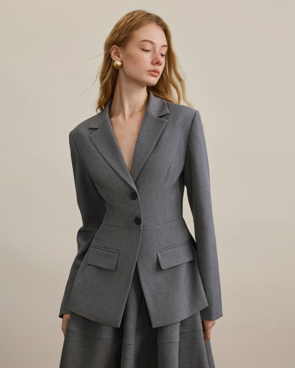 Structured waist blazer with a gentle hourglass cut; skirt drapes naturally for a smooth A-line flow. Choose your regular size for a sharp, feminine silhouette.