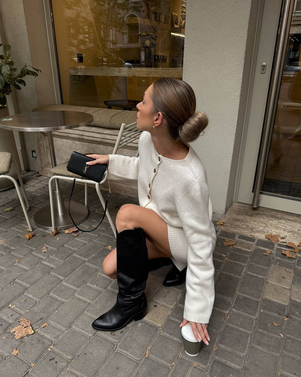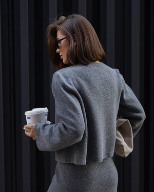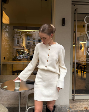 • Design Elements: Button-down cropped cardigan + matching mini skirt, ribbed edges, clean crew neckline
