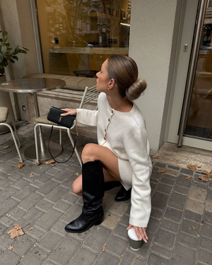 Regular fit with slightly cropped cardigan and fitted mini skirt. Pick according to your body measurements above; if between sizes, size up for a relaxed look or if you prefer extra layering room under the cardigan.