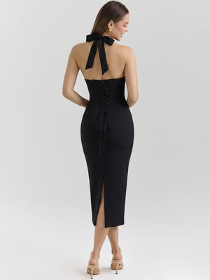 Lace-Trimmed Halter Corset-Back Midi Dress