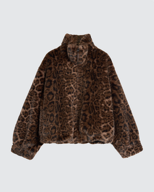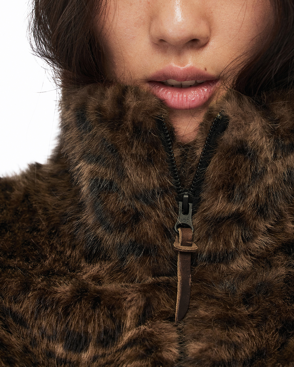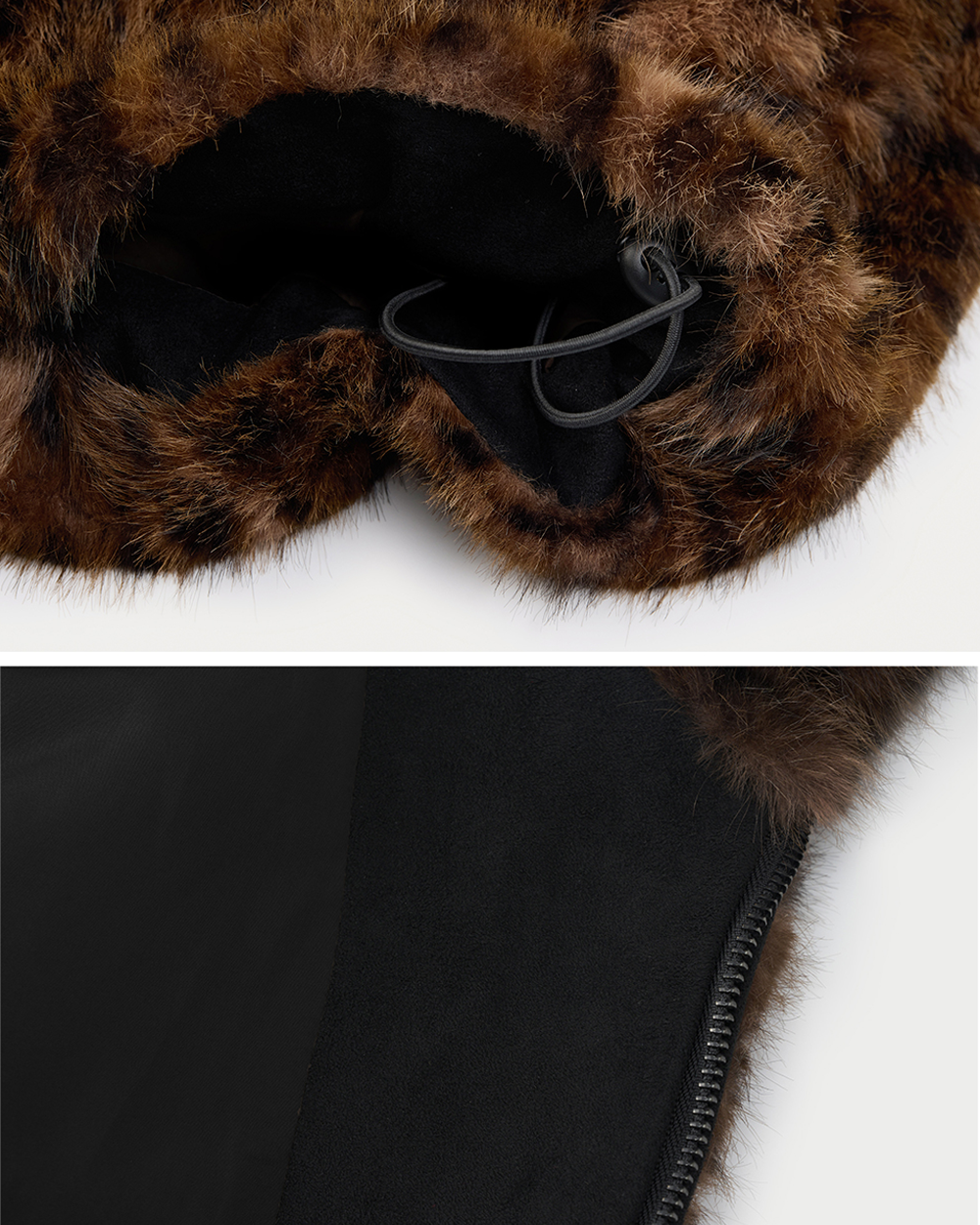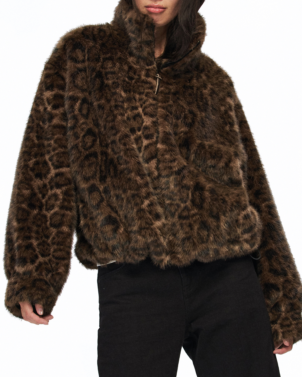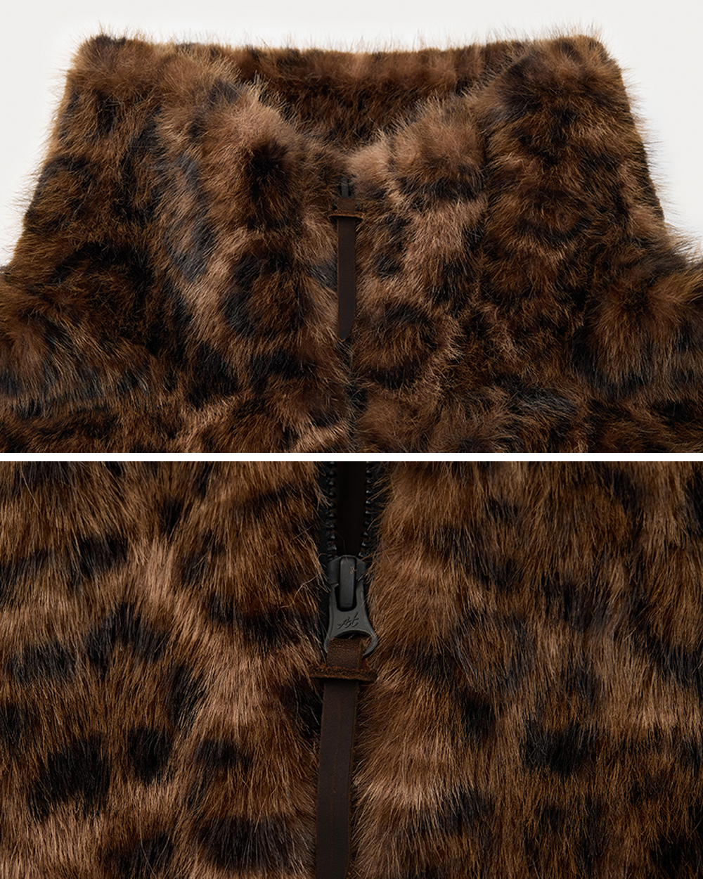 • Design Elements: Oversized silhouette, high stand collar, animal print faux fur, windproof zipper