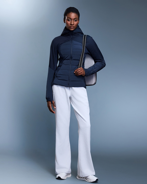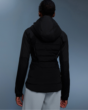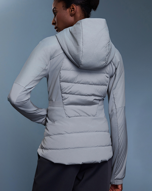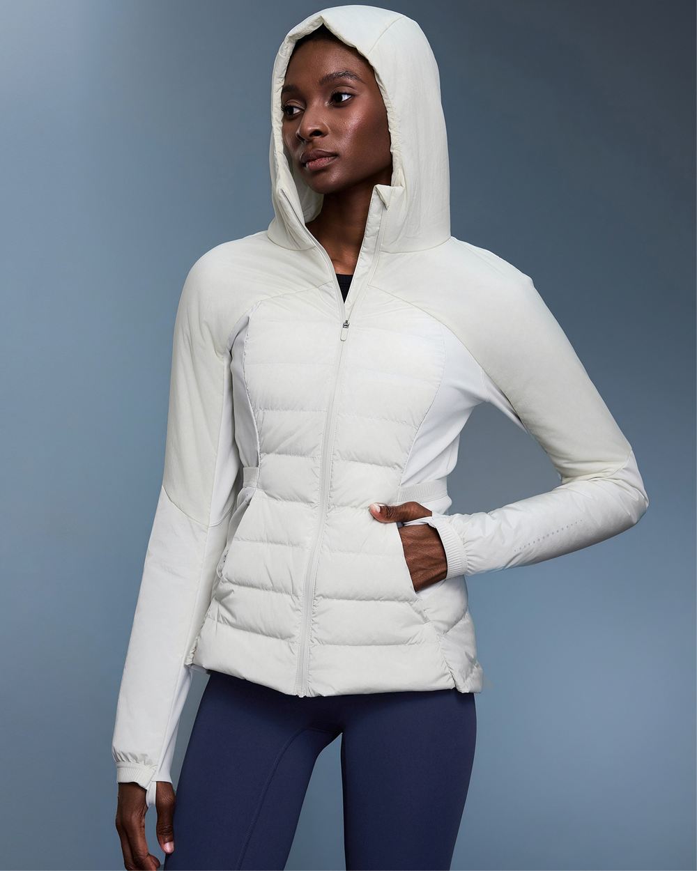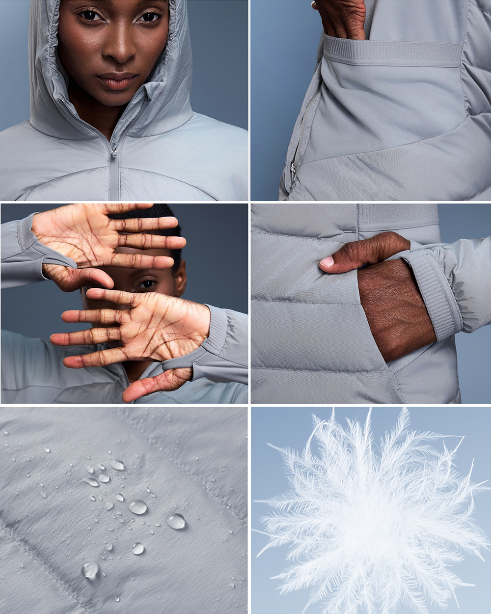 • Design Elements: Hooded stand collar, contrasting panels, slim-fit design, zip front