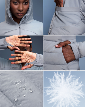 • Fabric Composition: 95% Nylon, 5% Spandex; filled with 90% white duck down