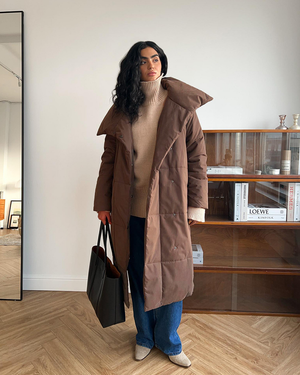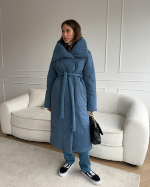 • Design Elements: Oversized collar design, adjustable waist belt, minimalist quilting, and full-length warmth coverage
