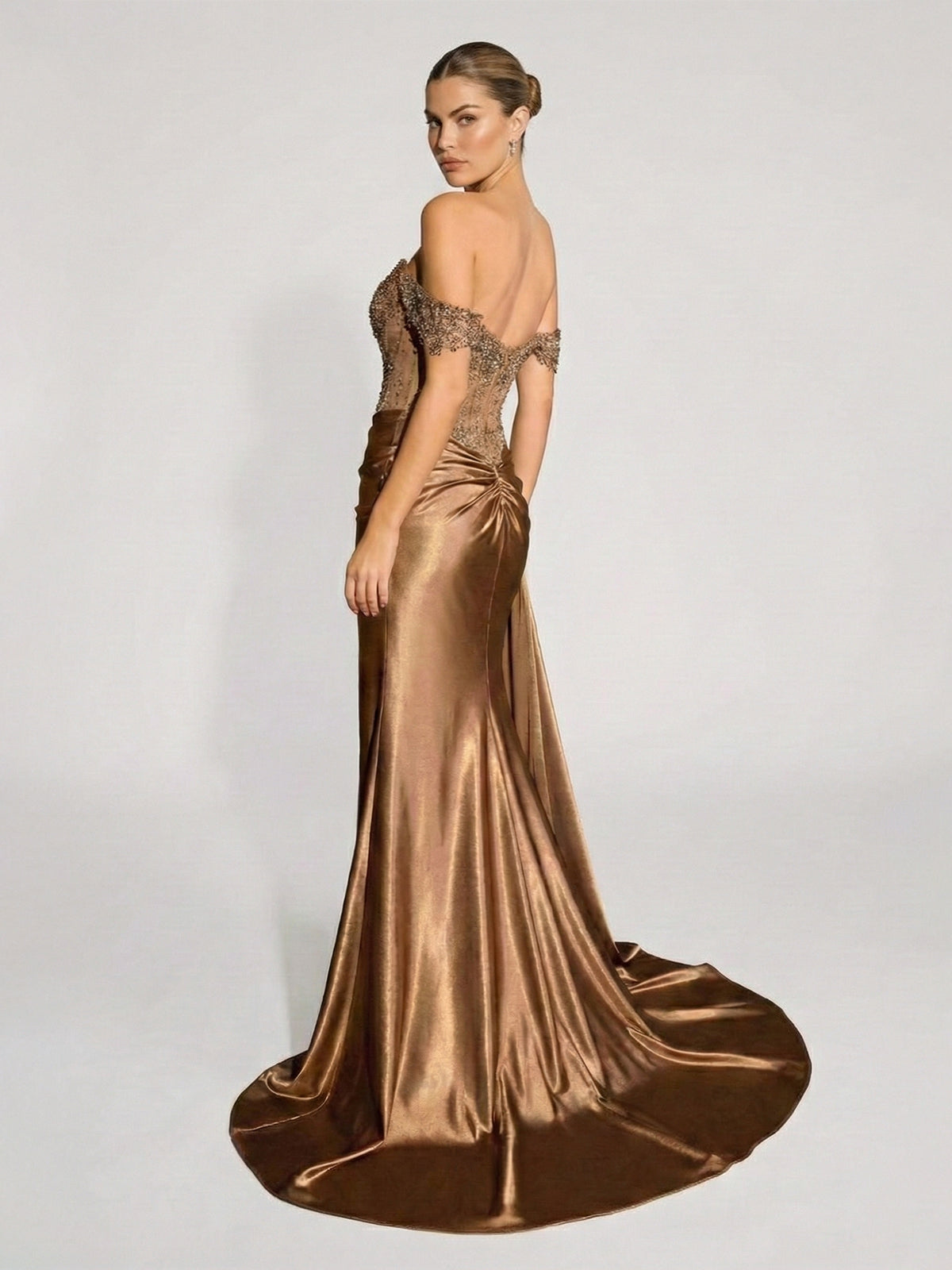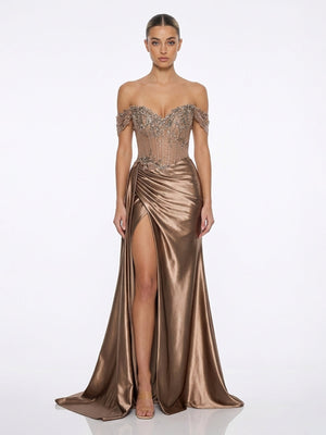 Off-Shoulder Beaded Corset Satin Gown High Slit Maxi Dress