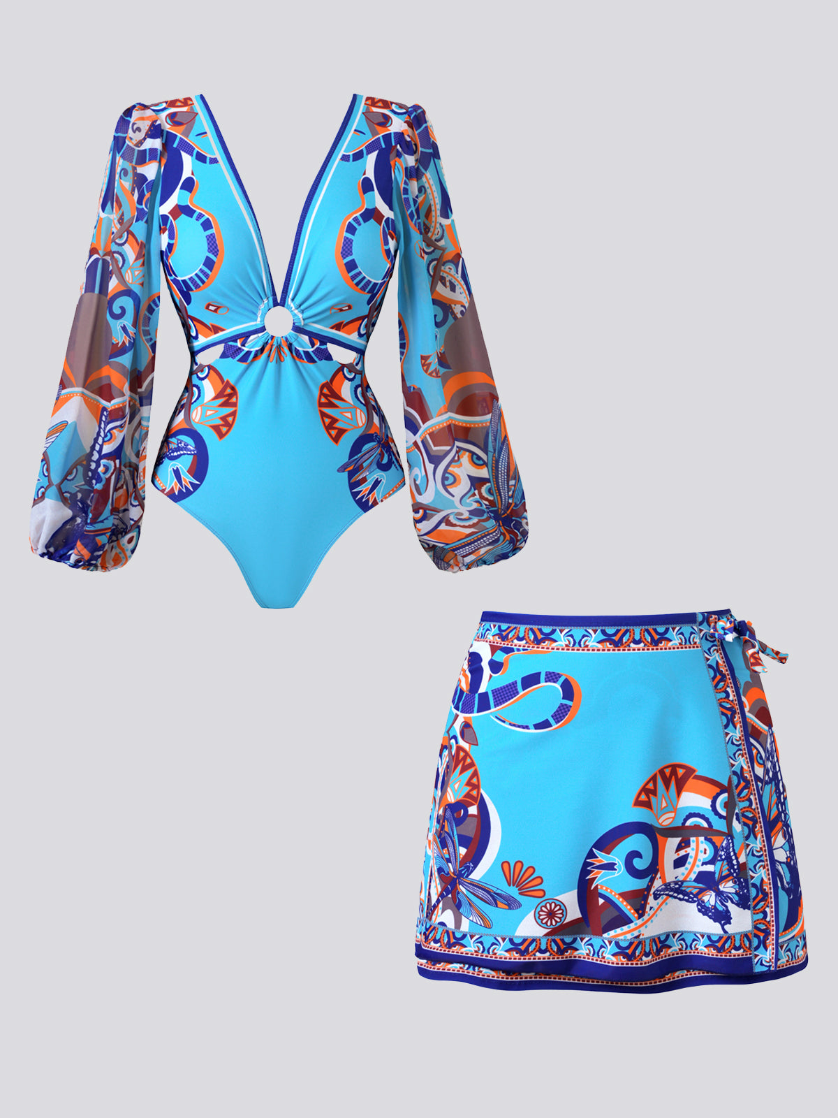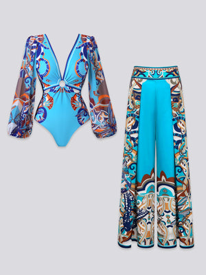 Ornate Pattern Ring-Detail Plunging Swimsuit Set