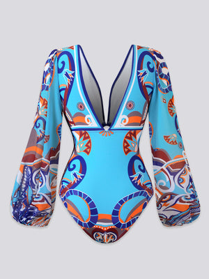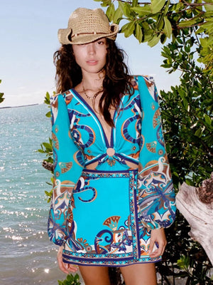 - High-impact ornate patterns and billowy lantern sleeves that bring maximum vacation energy to your look.