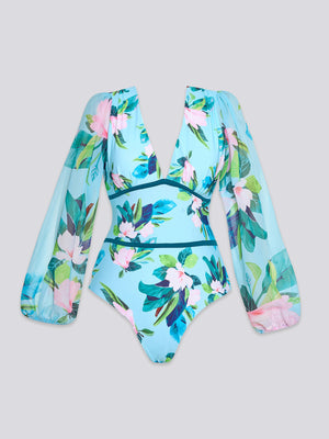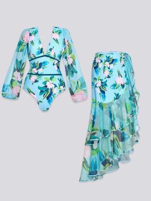 Plunging Floral Lantern-Sleeve Swimsuit Set