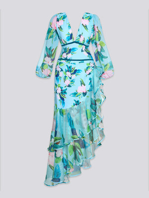 This vibrant floral creation is the ultimate vacation show-stopper. Combining a high-impact plunging bodysuit with a dramatic tiered ruffle skirt, this ensemble is designed for statuesque elegance and a perfectly snatched fit at your next exclusive getaway.