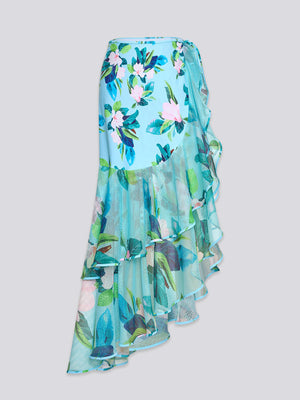- Wrap-style skirt with tiered ruffles that add beautiful architectural movement.