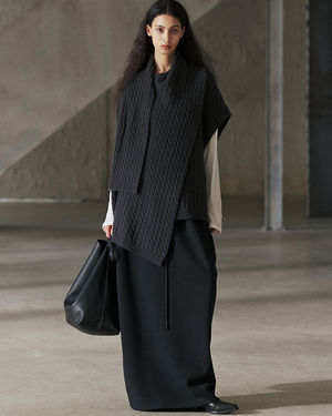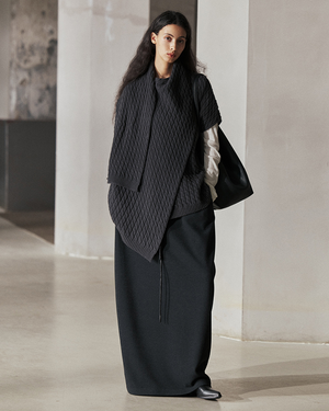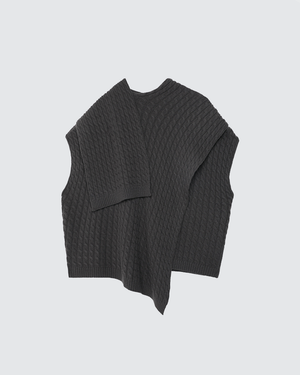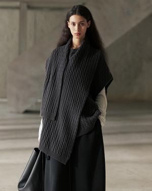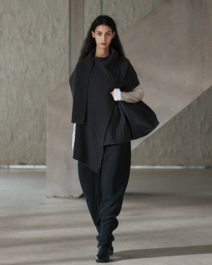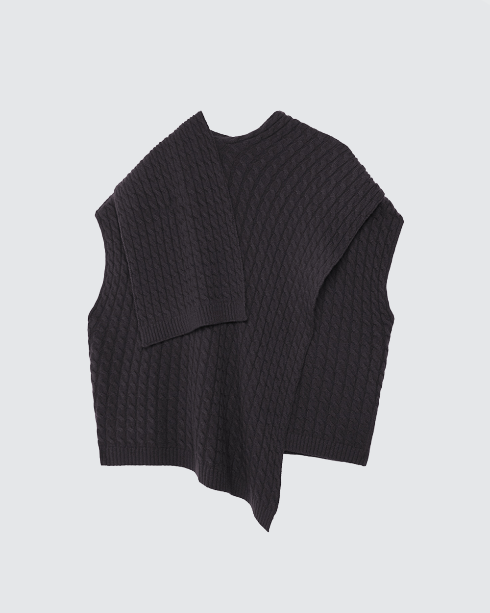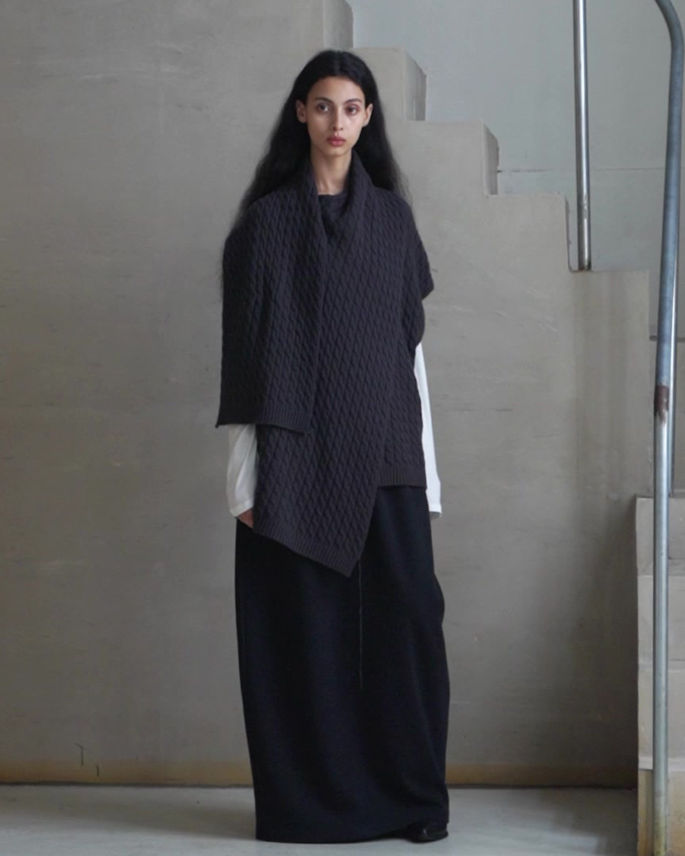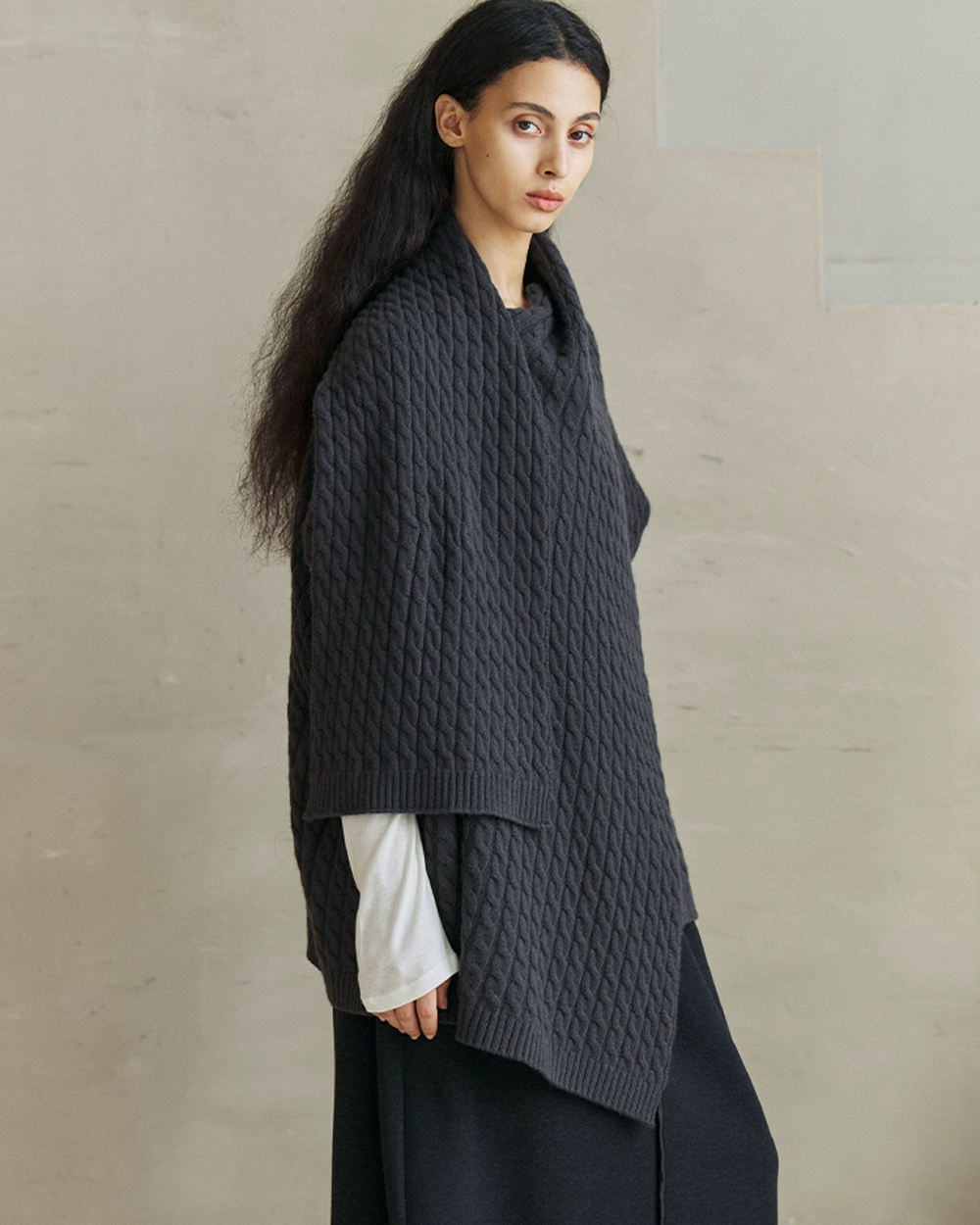 • Design Elements: Cable knit pattern, asymmetrical drape, poncho-style silhouette