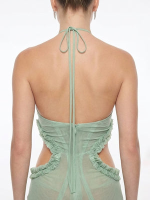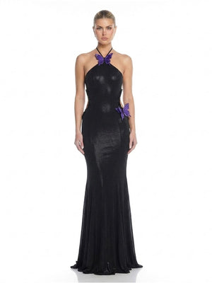 Sheer Mesh Cutout Halter Silhouette Butterfly Maxi Dress