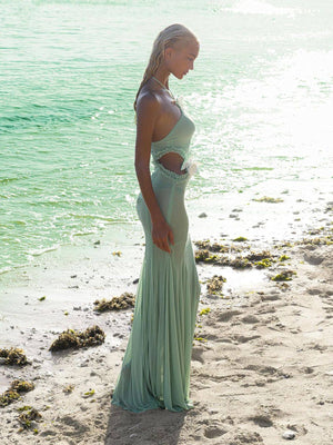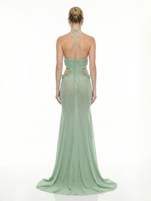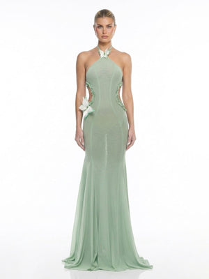 Make an ethereal statement in this daring and whimsical creation. Crafted from sheer mesh, the silhouette features a halter neckline adorned with a delicate butterfly applique. Dramatic side cutouts are framed by playful ruffles and additional butterfly details, leading to an open back with a tie closure. The look is finished with a graceful, flowing mermaid skirt that pools elegantly at the floor.