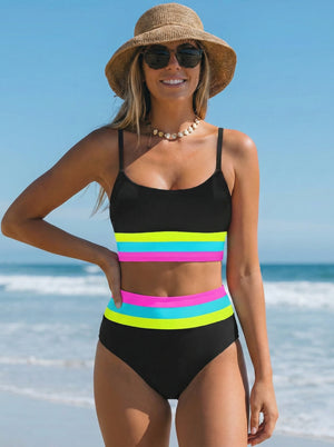 This vibrant creation defines sporty luxury and high-energy resort style. Featuring a bold neon color-block design and a versatile 3-piece silhouette, it’s the ultimate show-stopper for your next active beach day or pool party.